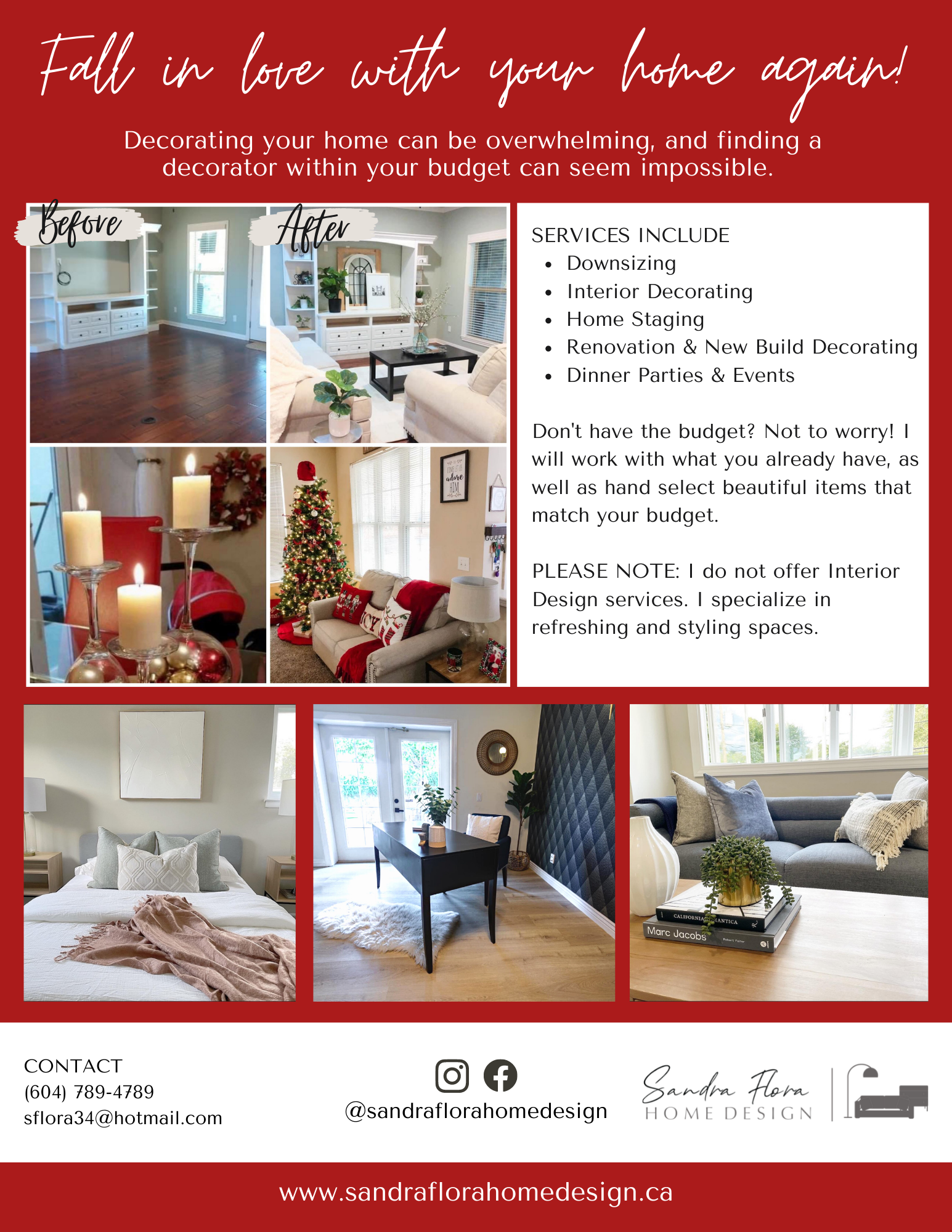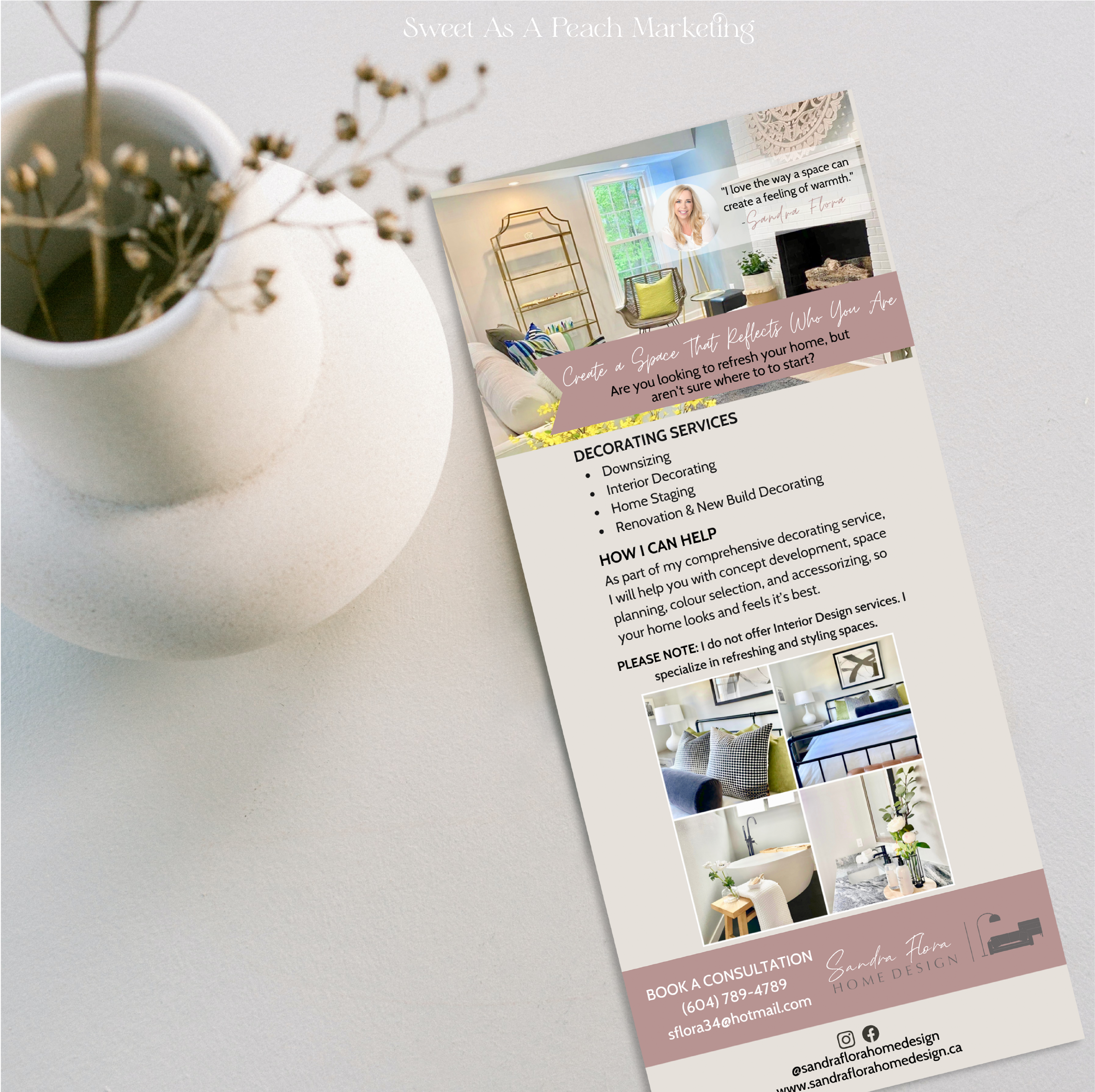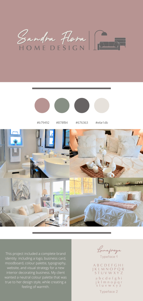 This project was for a new Interior Decorator. I created a website, logo, business card, font, and colour palette for my client to showcase their warm & inviting design style. I took the ideas they envisioned and brought them to life with my design concepts.